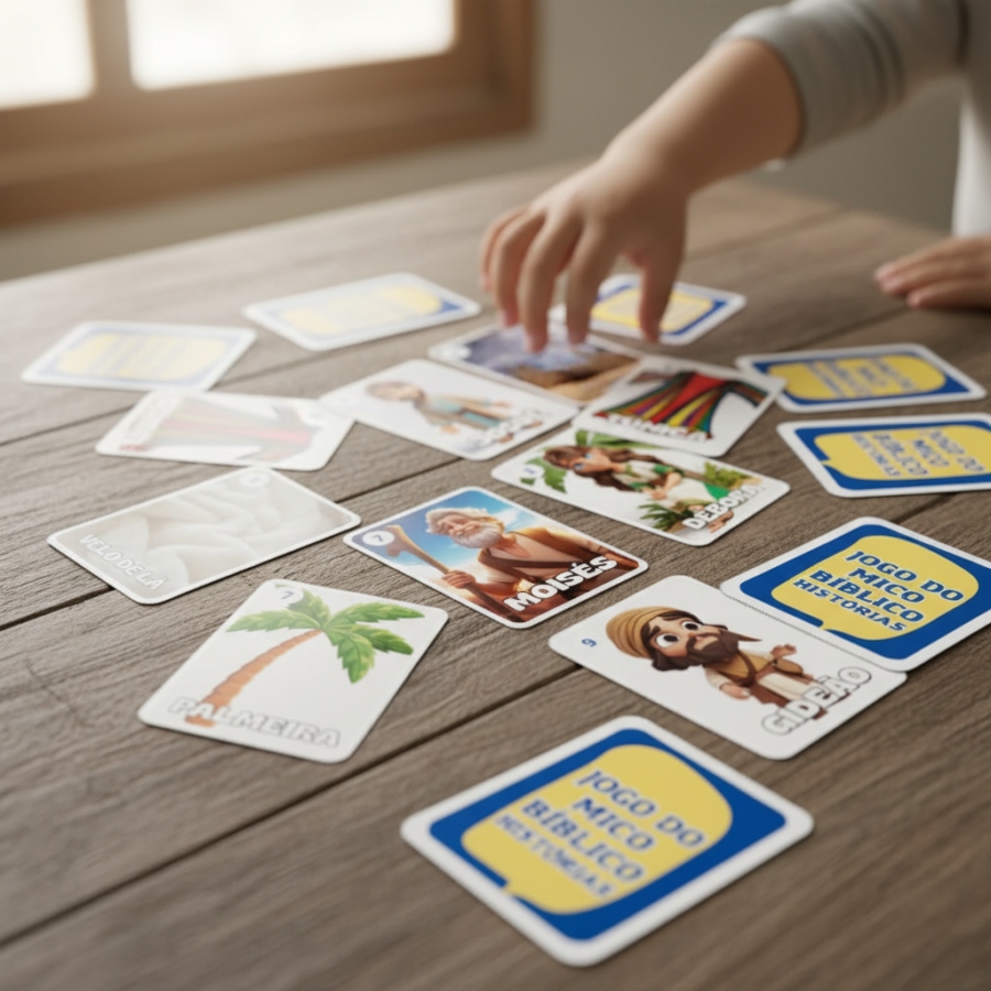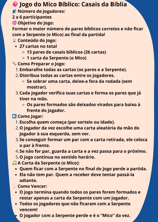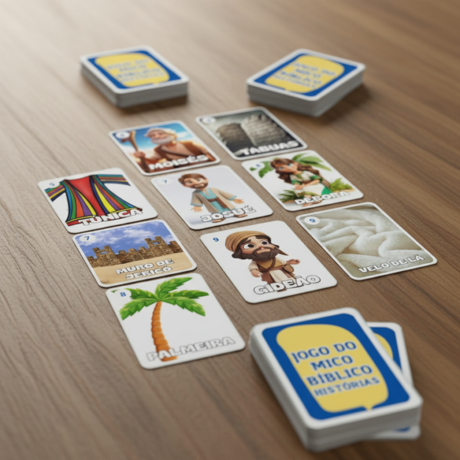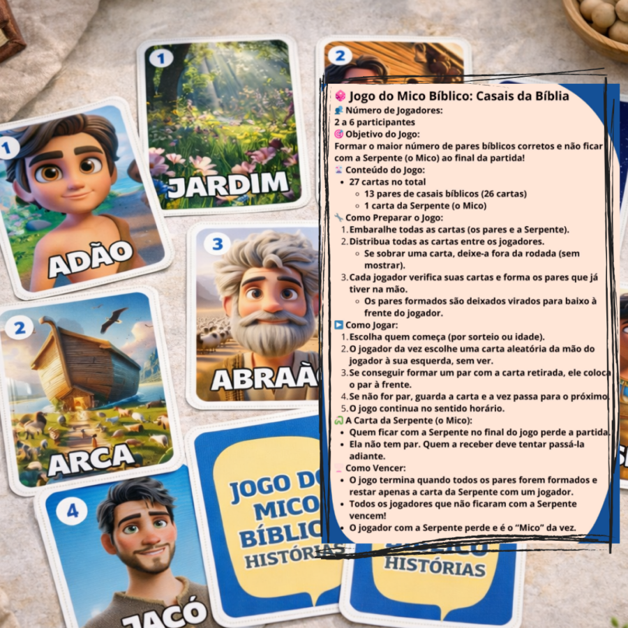 O Jogo do Mico Bíblico é uma versão divertida do clássico jogo, adaptado com elementos bíblicos para ensinar de forma leve, dinâmica e super envolvente.