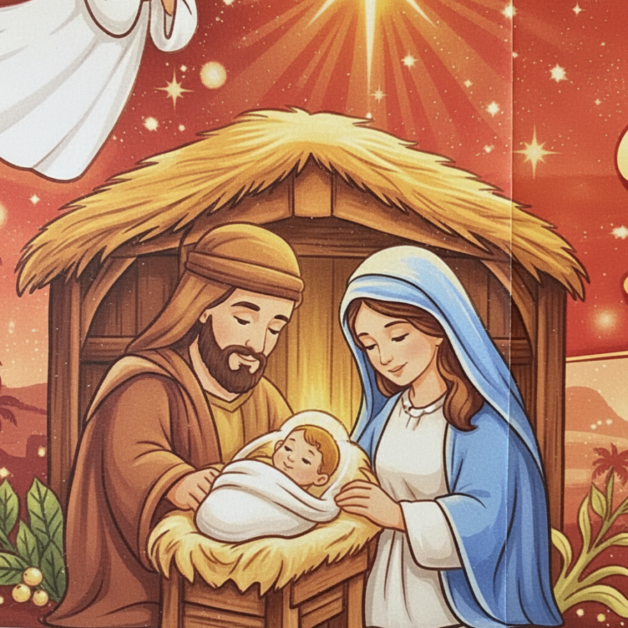 Perfeito para decorar igrejas, salas infantis e eventos especiais, esse painel traz um visual encantador que celebra o nascimento de Jesus de forma alegre e significativa.