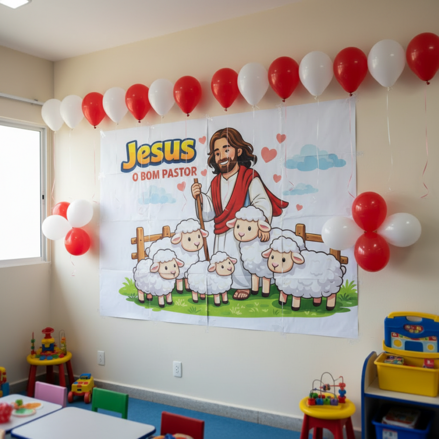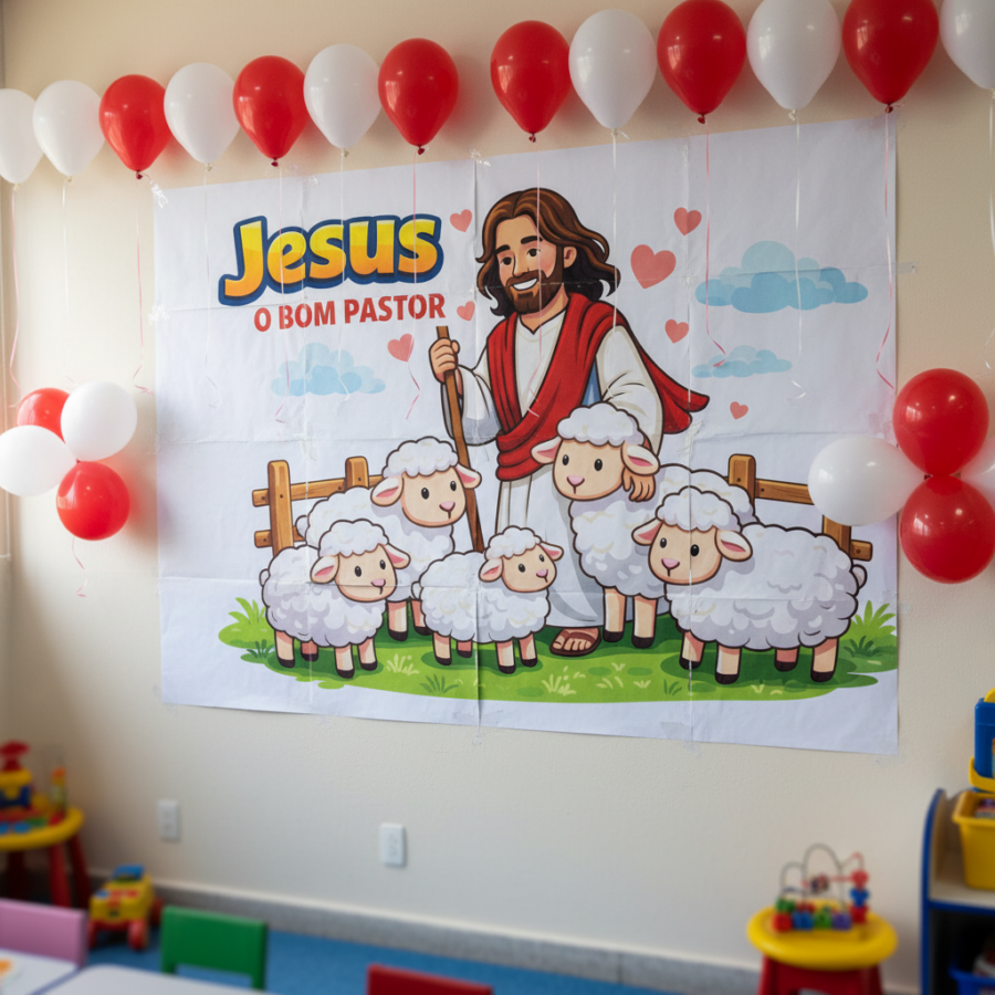 Leve para o ambiente infantil uma mensagem poderosa sobre o cuidado de Jesus com cada um de nós com o Painel Jesus, o Bom Pastor!
