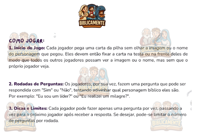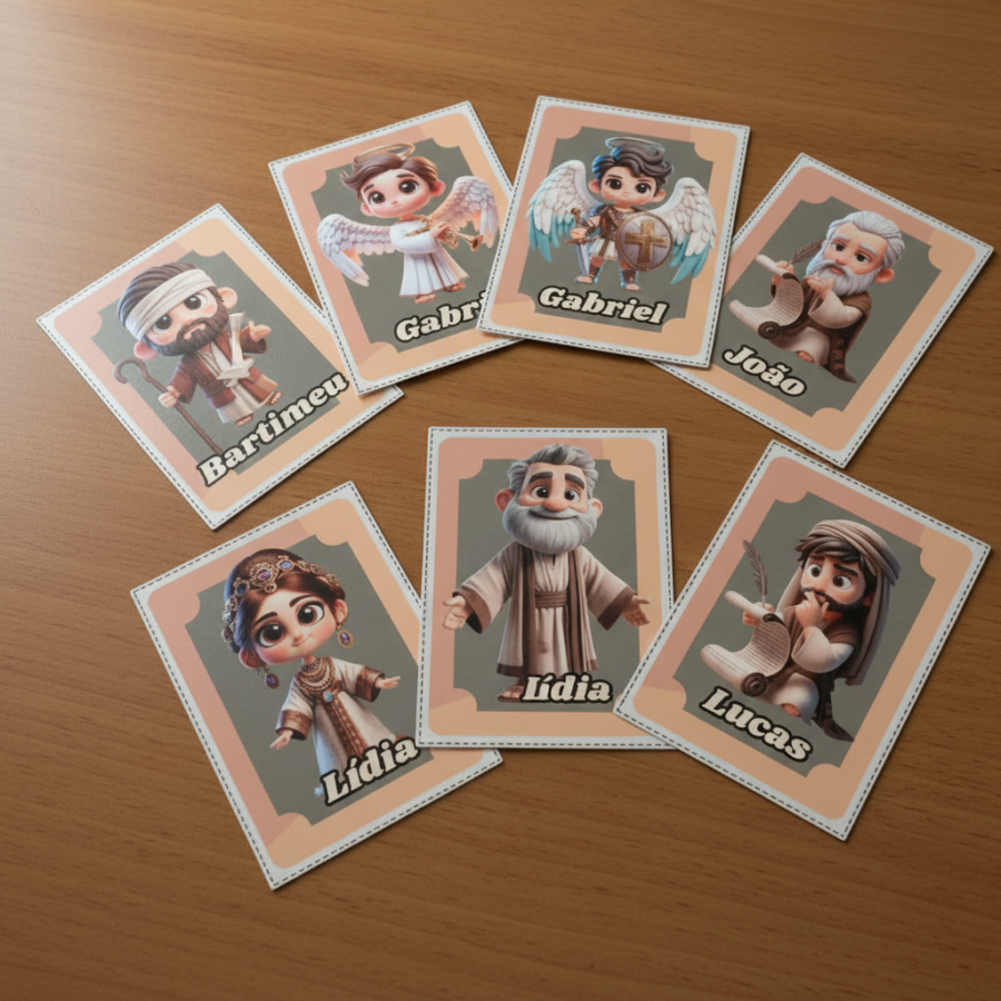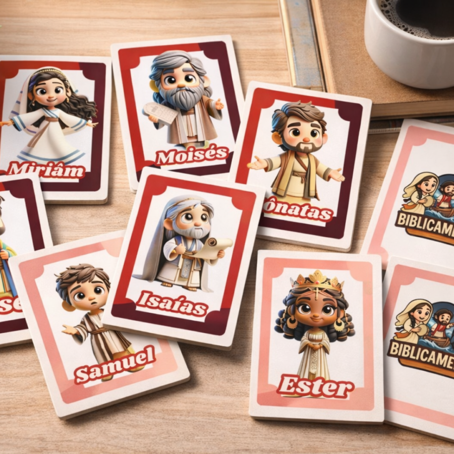 O Joguinho Bíblicamente é um recurso dinâmico com diversas cartinhas contendo personagens bíblicos, perfeito para estimular o conhecimento, a participação e a curiosidade das crianças de forma natural e envolvente.